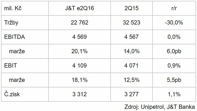 Podle Bohumila Trampoty, analytika J&T Banky, se v hospodářských výsledcích Unipetrolu negativně projeví neplánované i plánované odstávky. Pozitivní položkou, která by se měla v reportu objevit, je částečné plnění pojišťoven za loňskou havárii na etylénové jednotce v Chemparku Záluží u Litvínova. Tržby podle Trampoty firmě klesnou meziročně kvůli odstávkám o 30 % na 22,8 miliardy Kč. Díky zaúčtování dosud přiznaných záloh za loňskou havárii na etylénové jednotce ve výši přibližně čtyři miliardy korun by podle Trampoty měl provozní zisk EBITDA činit 4,6 miliardy Kč. "To by byla prakticky stejná hodnota jako loňský rekord. Bez této položky by zisk EBITDA měl dosáhnout 669 milionů Kč, meziročně o 85,4 % méně. Také čistý zisk by měl díky zmíněné položce vylepšit historický rekord a měl by činit asi 3,3 miliardy Kč (meziročně +1,1 %)," říká analytik. "Dále nás budou zajímat informace o procesu rekonstrukce poškozené etylénové jednotky v Litvínově, která by měla v těchto týdnech nabíhat do provozu, a situace po havárii v Kralupech. Předpokládáme, že podobné pojištění jako na Litvínov se vztahuje i na Kralupy. Zajímat nás bude pravděpodobná délka odstávky," dodává Bohumil Trampota. "Unipetrol již před dvěma týdny oznámil provozní údaje - rafinérská marže ve druhém čtvrtletí pokračovala v poklesu, zatímco petrochemické marže se držely na velmi solidních úrovních. Pozitivní byl i vývoj rozdílu mezi cenou ropy Brent a Ural," doplňuje Josef Němý, analytik Komerční banky.