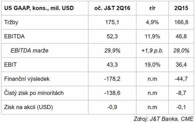 Pavel Ryska, analytik z J&T Banky, odhaduje, že se tržby CME ve druhém čtvrtletí meziročně zvýšily o 4,9 % na 175,1 milionu USD, přičemž růstu podle něj pomohlo posilování evropských měn vůči dolaru. "I přes potřebu více investovat do programové tvorby očekáváme, že díky vyšším tržbám vzrostla EBITDA marže z 28 % na 29,9 %. Zisk EBITDA podle nás stoupl o 11,9 % na 52,3 milionu USD. V rámci refinancování CME odkupovala dluhopisy se splatností v roce 2017 nad účetní hodnotou, což přináší ztrátu přibližně 150 milionů USD. Tato ztráta je sice pouze účetního charakteru, není hotovostní, ale povede podle nás k čisté ztrátě ve výši 138,6 milionu USD neboli 90 centů na akcii," říká Ryska. "Během konferenčního hovoru očekáváme potvrzení letošního výhledu na růst zisku EBITDA o 11-19 %, což znamená výsledek asi 136–146 milionů USD. Čísla by tak měla potvrdit pozvolné zlepšování výsledků na provozní úrovni, investoři však mohou negativně vnímat hlubokou čistou ztrátu," dodává Ryska.