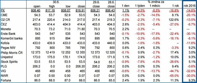 Níže jej srážely zejména finanční tituly (Erste a VIG zhruba -30 %), ztrácely i ČEZ, Kofola ČS, CME nebo O2 Czech Republic. Zatím nejúspěšnějšími akciemi roku jsou naopak Fortuna, Unipetrol a Pegas Nonwovens, v plusu se drží i Philip Morris ČR nebo Stock Spirits.
