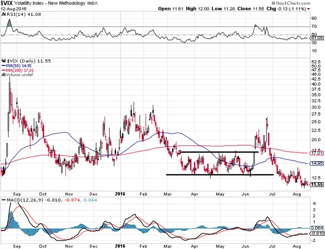 Index volatility VIX zůstává na extrémně nízké úrovni a vysílá ohledně akcií býčí signál. Ani případný nárůst do letos po dlouhou dobu platného rozmezí 13-17 bodů by nebyl vyloženě prodejním signálem, varováním ano.