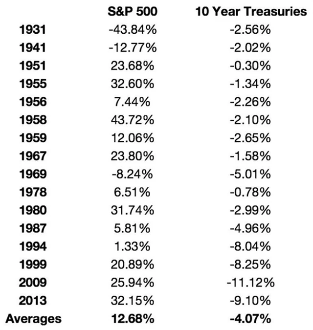 Na úvod přehled roků, kdy 10leté vládní dluhopisy USA zaznamenaly ztrátu, a k nim výkonnost amerického akciového trhu: