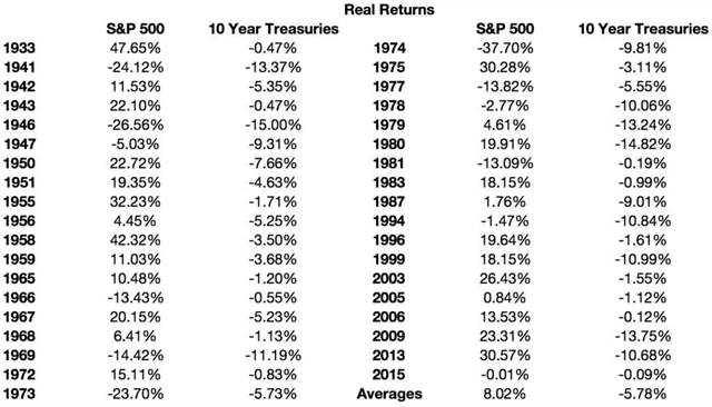Pokud se vrátíme k původnímu příkladu, je pravda, že mezi lety 1950 a 1981 dluhopisy naopak zaznamenaly silný medvědí trh, který byl způsoben především silnou inflací. Nominální roční výnosy se sice pohybovaly kolem 3 % ročně, ale reálně to bylo -1 %, což ve výsledku znamenalo ztrátu 40 % za celé období. Akcie v té době vydělaly více než 500 % i po odečtení inflace.
