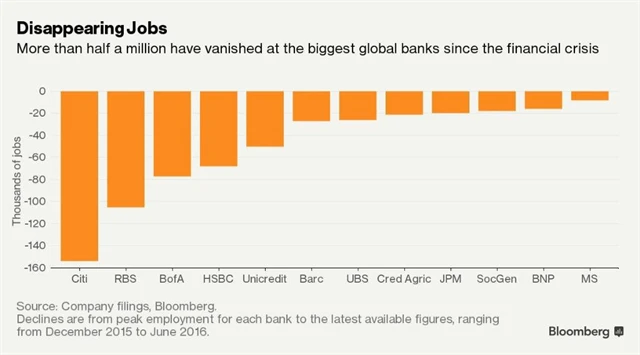 Během osmi let od finanční krize zrušily největší světové banky více než půl milionu pracovních míst. Hedgeové fondy za stejnou dobu s cílem podpořit svoji konkurenceschopnost výrazně seškrtaly poplatky a rovněž se zbavily velkého množství svých zaměstnanců.