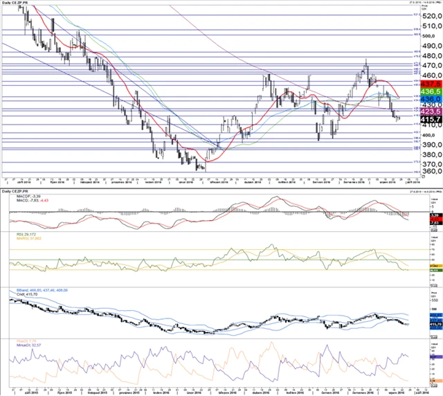 Technická analýza cen akcií ČEZ a Komerční banky. (29. 8. 2016)