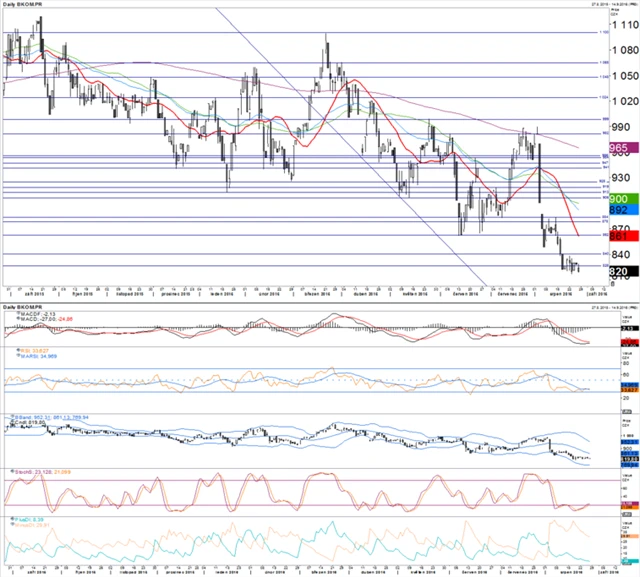 Akcie Komerční banky po celý týden oscilovaly kolem 820 Kč, nacházejí se mírně pod touto hranicí. Nejvýše je 200denní průměr, poté následují krátkodobější, cena je až pod nimi. To ukazuje na medvědí trend. MACD je nadále hluboko v negativním pásmu, nicméně je blízko proražení signální linie zespodu. RSI je stále nízko na úrovni 33 bodů. Bollingerovo pásmo nevysílá žádný zásadní signál. Stochastické křivky prorazily pásmo přeprodanosti, rychlá linie je nad pomalou. Technické indikátory poukazují spíše na stagnaci.