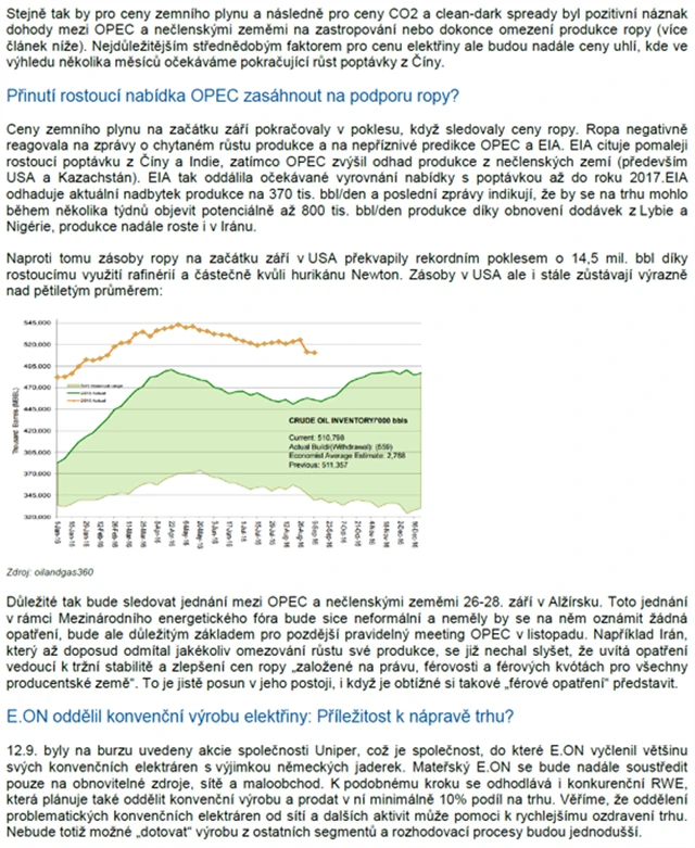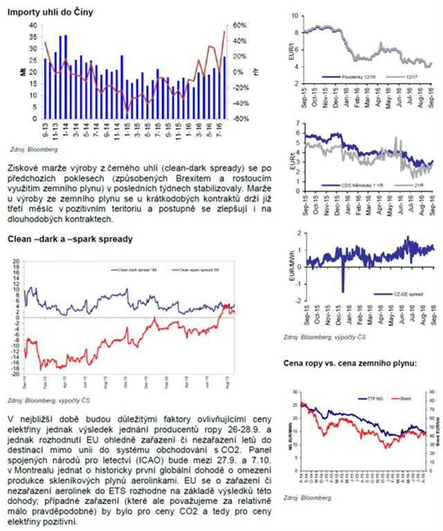 Ceny elektřiny v Německu na začátku září nadále mírně klesaly z červnových maxim, aby se v posledních dnech vrátily k růstu. Ceny v ČR pod vlivem pokračujících problémů ČEZ s odstávkami jaderných elektráren (v Temelíně byly odstávky na prvním bloku prodlouženy téměř o měsíc, na druhém bloku o 14 dnů) dále rozšířily prémii vůči německým cenám již na více než 1 EUR/MWh.