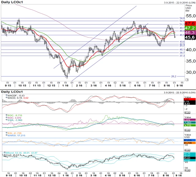 Technická analýza měnového páru EUR/USD a cen ropy Brent a zlata. (3. 9. 2016)