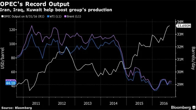 Problémy jsou ale také na straně nabídky, kde se země sdružení OPEC nemohou dohodnout na omezení těžby ropy. V tomto směru je nejvíce problematický Írán, který chce nejprve dostat svou produkci na úroveň před sankcemi, a až pak je ochoten podpořit snahy OPEC a ostatních ropných velmocí o stabilizaci trhu. Produkce OPEC se tak na konci srpna dostala na dlouhodobá maxima, protože jednotlivé země se nechtějí vzdát svého tržního podílu.
