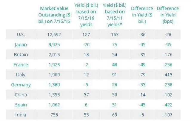 Největší ztráty se týkají japonských státních dluhopisů, u nichž ztráty kvůli poklesu výnosů pod nulu činí kolem 95 miliard dolarů, u amerických státních dluhopisů je to 36 miliard dolarů.
