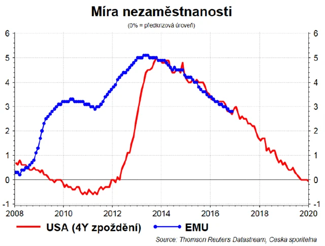 Míra nezaměstnanosti navíc utěšeně klesá. A pokud bude klesat současným tempem, tedy podobně jako v USA před čtyřmi lety, dostane se na předkrizovou úroveň v roce 2020. Proto také očekáváme, že ačkoli centrální banka postupně ukončí program odkupů aktiv (rok 2018), zvýšení depozitní sazby přijde na pořad dne až na konci 2018.
