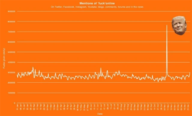 Zastavme se na chvíli u poslední položky pestrého seznamu. Asi vás zrovna nebude šokovat to, že vůbec nejvíce lidé slovem fuck internet bombardovali 9. listopadu. Právě v ten den byly oznámeny výsledky amerických prezidentských voleb. Zatímco v průměru na internetu slovo fuck přistálo loni každý den asi 2,6milionkrát, 9. listopadu lidem zakázané slovo vyklouzlo 7,6milionkrát.