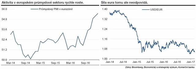 Vstup do roku 2017 se evropské ekonomice vydařil. Naznačuje to řada předstihových indikátorů včetně indexů nákupních manažerů (PMI), které měří náladu v průmyslových firmách a v sektoru služeb. Euro vůči dolaru se ale potácí na dohled často skloňované parity.