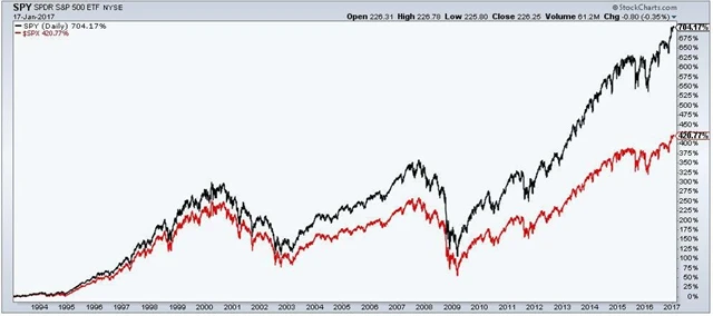 Následující graf ilustruje, jak rozdílně se zhodnocují index S&P 500 a burzovně obchodovaný fond SPDR S&P 500, jehož podkladem je právě tento index. Zatímco index S&P 500 zpevnil za posledních 24 let "jen" o 421 %, SPDR S&P 500 přidal 704 %. Rozdíl je způsobený tím, že v případě fondu se zhodnocují i reinvestované dividendy, zatímco samotný index s dividendami nepočítá.