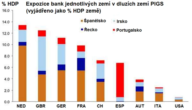 Evropská ekonomika je mnohem více závislá na svém bankovním sektoru než ta americká. Případné krachy evropských zemí by tak ovlivnily evropskou ekonomiku více než podobné události ve Spojených státech. Tvrdí to banka Goldman Sachs. Také akciové trhy v Evropě jsou náchylnější k negativní reakci - bankovní sektor zde v květnu zaujímal přes 20 procent tržní kapitalizace, ve Spojených státech jen něco přes 15 procent. Přehledný graf zobrazuje expozici bank jednotlivých zemí v evropských dluzích. Podle něj je větší hrozbou pro evropské banky případný krach Irska než Řecka. Největší podíl mají v portfoliích bank samozřejmě dluhy Španělska.