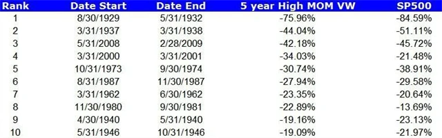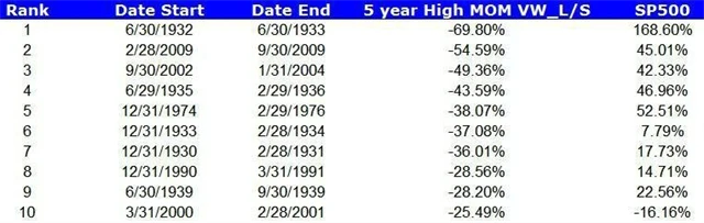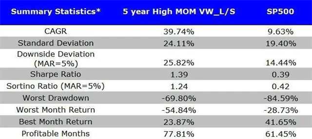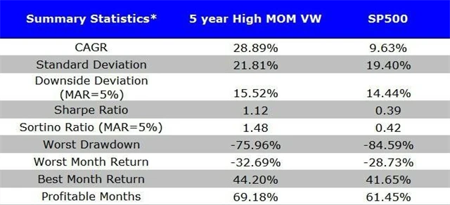 V tabulce níže je pár základních údajů týkajících se ideálního portfolia (označeného jako High MOM VW) v porovnání s indexem S&P 500. Průměrný výnos je dobrý, ale mírným překvapením může být fakt, že i přes předem známou výkonnost a výběr nejvýnosnějších titulů je u portfolia větší volatilita než u indexu S&P 500.