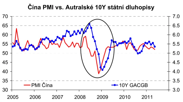 Minulý týden jsem například upozorňoval na rizika v Číně. Pokud chcete vsadit na zpomalení v Číně, můžete nakupovat např. státní dluhopisy zemí, které mají silnou obchodní vazbu na čínskou ekonomiku (např. Austrálie). Pokles produkce (měřeno důvěrou ve výrobní sféře) povede ke snížení růstu australské ekonomiky, na což bude reagovat místní centrální banka snížením sazeb. A pokles sazeb se přetaví do poklesu dlouhodobých sazeb, tedy i výnosů státních dluhopisů.