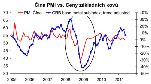 Pokud preferujete komodity, lze podobnou strategii nalézt i zde. Druhý obrázek ukazuje korelaci mezi produkcí v Číně a komoditním indexem základních kovů. Upozorňuji, že jde o vývoj indexu očištěný o trend. A pětiletý průměrný růst je zhruba 20-25 % ročně.