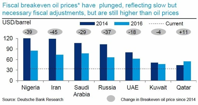 Řada zemí, které si díky obrovským zásobám ropy mohly dovolit dotovat ostatní sektory ekonomiky, začala šetřit (byť to například v zemích Perského zálivu stále může působit komicky). Vyrovnané rozpočty jsou pro ně ale i po změnách ve fiskální oblasti nedosažitelné, a musejí tak sahat stále hlouběji do rezerv.