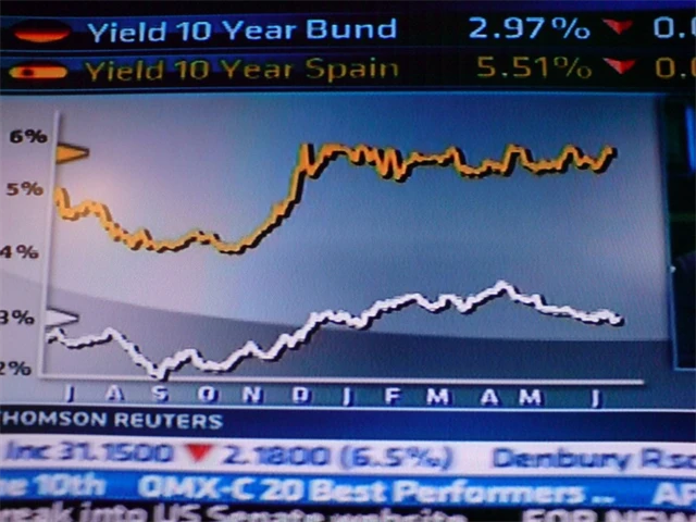 Na přiloženém grafu, který náš redaktor narychlo vyfotil z vysílání zpravodajské stanice CNBC, je dobře vidět, jak je výnos španělských státních dluhopisů uměle držen pod 6 %. Jinými slovy, "někdo" nedovolí, aby španělské dluhopisy dál oslabovaly. Vždy, když se výnos přiblíží 6 %, dluhopisy někdo skoupí, je to jak podle pravítka.