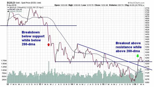 Na začátku roku 2013 se cena zlata poté, co klesla pod 200denní klouzavý průměr, svezla pod hladinu podpory na úrovni kolem 1 575 dolarů za trojskou unci. Pod silným tlakem poté cena žlutého kovu byla až do konce loňského roku, kdy se odrazila od 1 050 dolarů za trojskou unci a dostala se nad 200denní klouzavý průměr. Jen o několik dnů později se navíc cena přehoupla i přes hladinu odporu kolem 1 225 dolarů za trojskou unci, přičemž zároveň proťala i horní hranu sestupného kanálu. A z hladiny odporu se posléze stala hladina podpory.