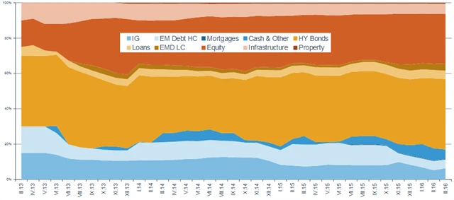 Portfolio fondu rozdělujeme do tří tříd aktiv. Těmi jsou příjmová aktiva (income), hybridní aktiva (hybrid) a růstová aktiva (growth). Hybridy se vyznačují kombinací vlastností příjmových a růstových aktiv a zahrnují například dluhopisy s vysokým výnosem (high yield) a dluhopisy z rozvíjejících se trhů v místních měnách. Pro tyto skupiny aktiv držíme dlouhodobé neutrální alokace. Rozdělení postupně měníme, aby co nejlépe odráželo měnící se podmínky na trhu a náš výhled, pokud jde o příjmy. Klíčem k úspěchu je provádět průběžně úpravy, což umožňuje akumulaci příjmu. Naším zájmem není hon za výnosy, když zvažujeme nové nápady, hledáme atraktivní úroveň výnosu při vhodné úrovni a typu rizika.