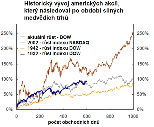 V minulosti byly ve Spojených státech jen tři medvědí trhy, kdy hlavní indexy ztratily víc než polovinu ze své hodnoty. Po silném propadu vždy následovalo období, ve kterém trhy rostly skoro tisíc obchodních dnů (pozn. nyní je to lehce přes 600). Aktuální růst hodně připomíná býčí období po splasknutí internetové bubliny v roce 2001. Kdyby měl trh následovat historický vývoj, tak i přes zaváhání v minulých měsících, nastolí hlavní indexy znovu růstovou fázi.