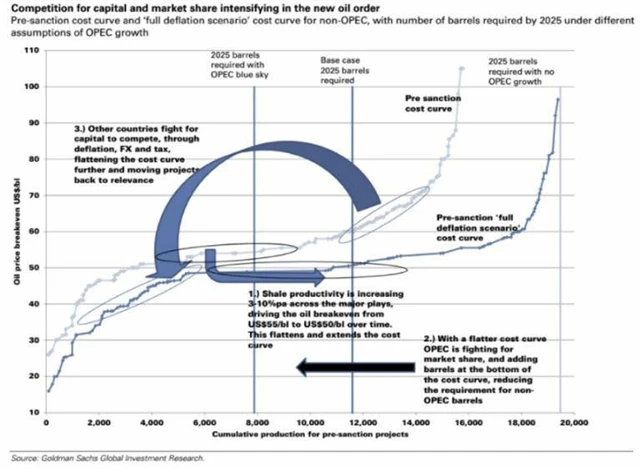 Goldman Sachs upozorňuje, že prakticky všechny ropné velmoci se snaží přilákat nový kapitál. Oblíbenými zbraněmi v tomto boji jsou optimalizace daňového zatížení ropného sektoru či různé pobídky. "Tato opatření mají přispět k dalšímu snížení nákladů na těžbu tak, aby produkce zůstala za každou cenu zisková," píše se v poznámce banky, která tvrdí, že narušit nový ropný normál může případné oslabení americké ekonomiky, jež by zpřísnilo podmínky úvěrování, bez něhož se producenti břidličné ropy dlouhodobě neobejdou.