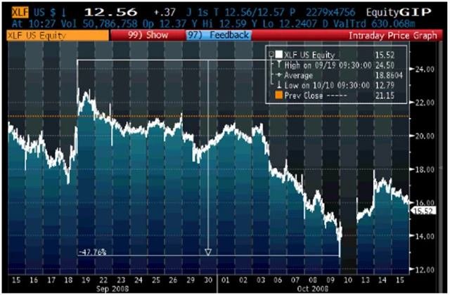 Belgie, Itálie, Španělsko a Francie dnes zakázaly prodávat "na krátko" akcie finančních institucí. Politici se tak snaží zabránit dalším propadům na akciových trzích. To se jim zatím daří a bankovní sektor se stabilizoval. Ovšem klíčovou otázkou zůstává, na jak dlouho. Pro toho, kdo rychle zapomíná, připojuji graf, který znázorňuje vývoj finančního sektoru v USA ze září a října roku 2008. Dne 19. září zakázal americký regulátor short-selling. Rally vydrželo pouze jeden den. Poté začaly finanční tituly opět klesat a propadly se až o 48 procent.