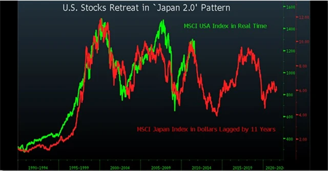 Obrázek srovnává průběh dvou grafů: v reálném čase porovnává americký index MSCI (zelený) a japonský MSCI index denominovaný v dolarech (červený). Vývoj japonského indexu je posunutý o 11 let dopředu. Z obrázku je patrné, že grafy jsou si do značné míry podobné. Je tedy možné, že v USA proběhne "japonský" scénář. Makroekonomické ukazatele tomu zatím nasvědčují.