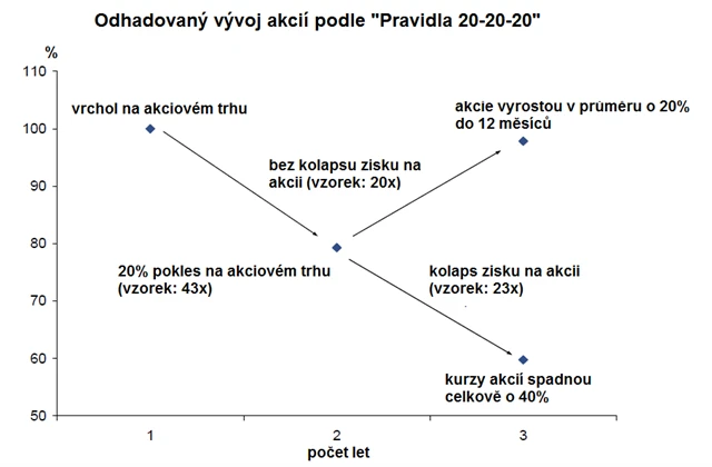 Hlavní akciové trhy ztratily ze svých květnových maxim okolo dvaceti procent. V minulosti (pozn. posledních 40 let) po takovém pádu následovaly vždy dva scénáře. První je pokračování medvědího sestupu o dalších 20 %, a to jedině v případě, že recese zasáhla také zisky firem (EPS=zisk na akcii), které klesly o deset a více procent. Tato recese v ziscích společností přišla po dvacetiprocentním pádu na burzách ve 23 případech. V ostatních 20 případech však recese zisky firem nezasáhla a od té doby akcie v průměru posílily do roka o 20 procent.