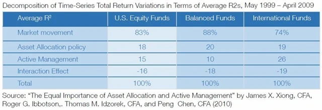 U aktivně spravovaných fondů investujících na akciových trzích ve Spojených státech měly podle studie ReSolve Asset Management na celkových výnosech průměrného portfolia mezi lety 1999 a 2009 přibližně 83% podíl pohyby trhu jako celku, zhruba 18% podíl alokační strategie a asi 15% podíl aktivní správa portfolia. Takzvané interakční efekty (nadvážení či podvážení nadprůměrně nebo podprůměrně výnosných aktiv) mezi lety 1999 a 2009 naopak výnosnost portfolia srážely, a to v míře zhruba odpovídající pozitivnímu příspěvku aktivního portfoliomanagementu.