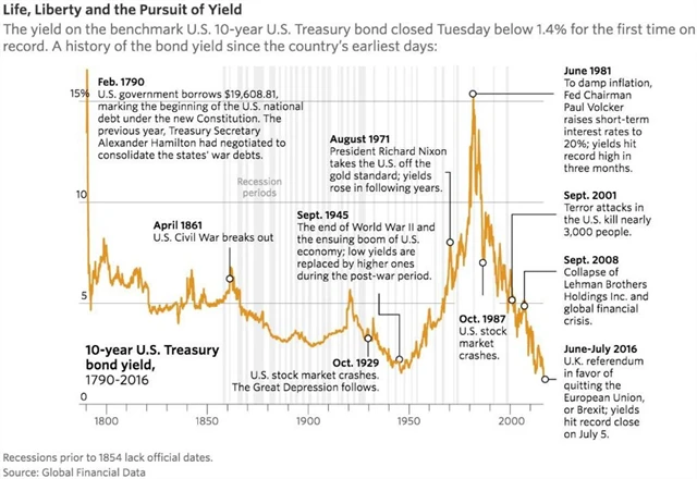 Příklon k bezpečným aktivům seslal po britském referendu výnosy dluhopisů vyspělých zemí na nová minima. 10letý vládní dluhopis USA se podíval na historická minima pod 1,4 %. Podívejte se, jak vypadala jeho cesta na dno v posledních dvou stoletích.