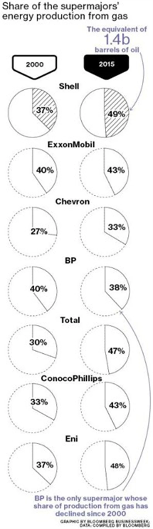Shell na to jde od lesa. Jedním ze zásadních kroků na cestě k nutné transformaci firmy bylo převzetí společnosti BG Group za 54 miliard dolarů. Shell získal zmiňovaný Curtis Island a další ložiska zemního plynu od USA po Kazachstán a ovládá 20 % světového trhu se zkapalněným zemním plynem, vlastní desítky obřích tankerů a dvojnásobnou výrobní kapacitu než jeho nejbližší konkurent, společnost ExxonMobil.