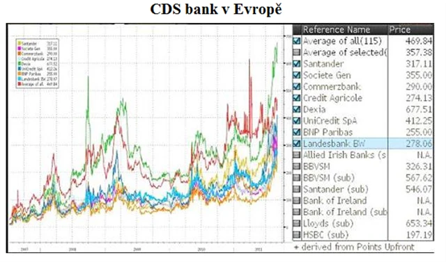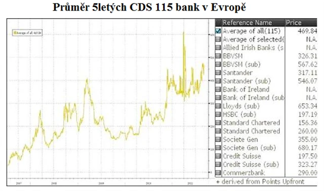 Na grafu 5letých CDS, které představují náklady na pojištění proti bankrotu, je zřejmé, že se situace v posledních měsících dále zhoršuje. Aktuálně je průměr CDS 115 evropských bank ještě výše než v roce 2008. Investoři vidí hrozbu krachu některých bank stále reálněji.