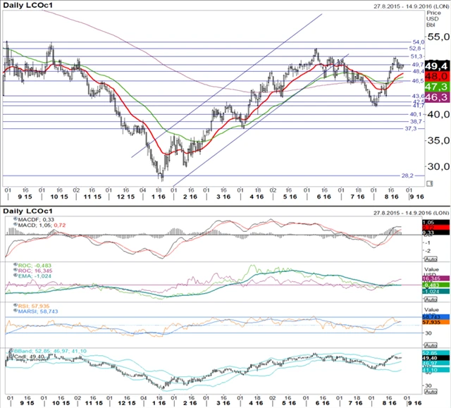 Podle očekávání došlo v uplynulém týdnu k obratu ve vývoji a cena ropy poklesla zpět pod 50 USD za barel. MACD je nad spouštěcí linií a mírně k ní klesá. RSI se odrazil od hranice 70 bodů, výrazně poklesl, ale stále spíše ukazuje na překoupený trh. ROC nevysílá jasný signál. Cena ropy se odrazila od horní hranice Bollingerova pásma. Technické indikátory nedávají jednoznačnou zprávu, ale spíše naznačují, že by v následujících dnech mělo dojít k dalšímu poklesu ceny ropy či k její stagnaci.