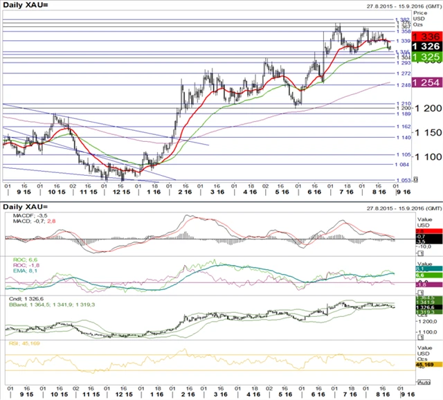 Cena zlata v uplynulých dnech poklesla až pod hranici 1 330 USD za trojskou unci. MACD je pod spouštěcí linií a stále klesá. ROC je v kladných hodnotách a mírně klesá. RSI je u hranice 45 bodů a dochází u něj k obratu. Cena je v blízkosti dolní hranice Bollingerova pásma. Technické indikátory ukazují ještě určitý prostor pro pokles ceny zlata, ale v následujících dnech by mohlo dojít k obratu a růstu ceny.