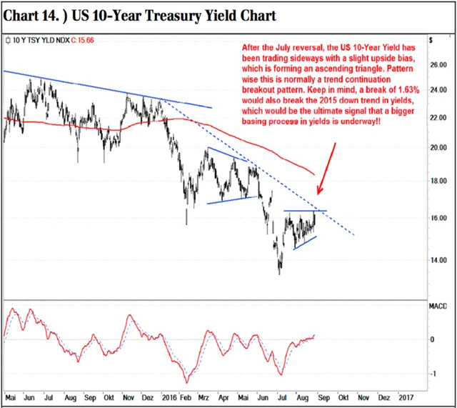 Právě tuto otázku si ve zprávě klientům z konce srpna, tedy ještě z doby před zveřejněním dat z trhu práce, položili Michael Riesner a Marc Müller, techničtí analytici z UBS. Podle nich se výnosy 10letých státních bondů USA pohybují doslova na hraně. Nárost výnosů nad 1,63 % podle nich spustí další tlak na ceny dluhopisů a růst výnosů na(d) 2 %. Právě hladina 1,63 % ohraničuje sestupný trend, který se na grafu výnosů začal formovat zhruba na začátku roku 2015.