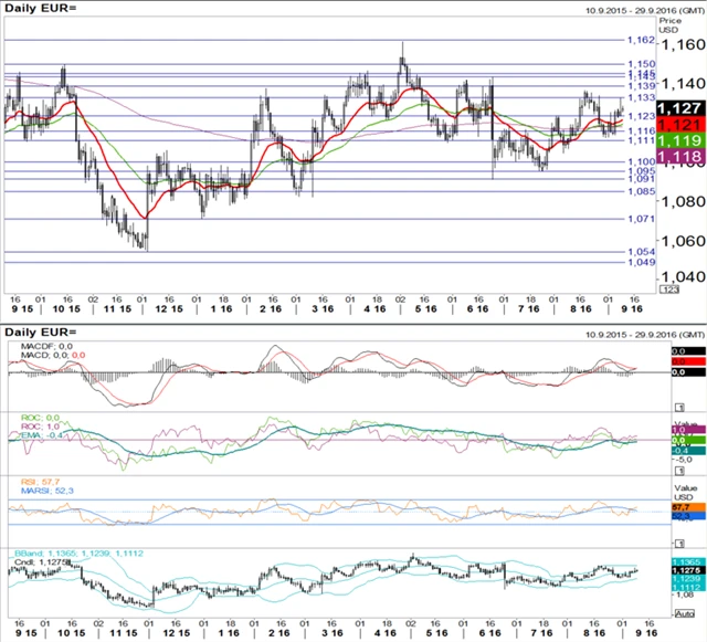 V posledních dnech došlo k růstu páru EUR/USD, který překonal hladinu odporu 1,123 i své klouzavé průměry. MACD proťala zespodu svou spouštěcí linii. ROC mírně roste a je nad exponenciálním klouzavým průměrem. RSI překonal 50bodovou hranici, ale stále je hluboko pod hranicí překoupenosti. Kurz se pohybuje ve středu Bollingerova pásma. Technické indikátory nevysílají jasný signál, spíše naznačují stagnaci.