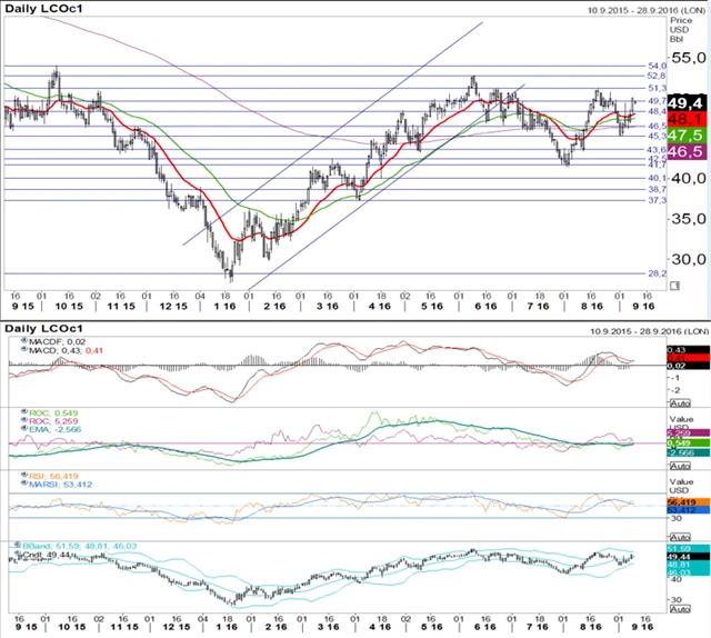 Technická analýza měnového páru EUR/USD a cen ropy Brent a zlata. (10. 9. 2016)