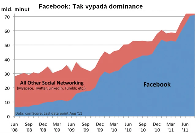 Facebook chystá novinky, stane se doslova životopisem každého uživatele. Počet lidí na "fejsu" se blíží jedné miliardě, za den se na svůj profil přihlásí až půl miliardy lidí. Konkurenti Facebooku mají před sebou úkol zvrátit neúprosný graf - až 90 % veškerého času na sociálních sítích lidé věnují Facebooku. Úkol těžký, pokud ne nemožný.