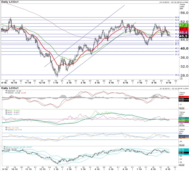 Ropa v uplynulých dnech pokračovala v poklesu pod své klouzavé průměry. MACD je pod spouštěcí linií, RSI je pod 50bodovou hranicí. Cena se drží v blízkosti dolní hranice Bollingerova pásma. Technické indikátory nenabízejí jasný signál, ale spíše naznačují, že sice ještě existuje nějaký prostor pro pokles, ale že v následujících dnech může dojít k obratu.