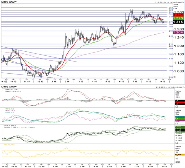 Cena zlata v posledních dnech nadále klesala pod své klouzavé průměry. MACD se drží těsně nad spouštěcí linií a mírně klesá. RSI se pohybuje pod 50bodovou hranicí. Cena zlata se drží při dolní hranici Bollingerova pásma. Technické indikátory nedávají jasnou zprávu.