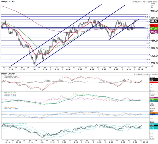 Technická analýza měnového páru EUR/USD a cen ropy Brent a zlata. (5. 10. 2016)