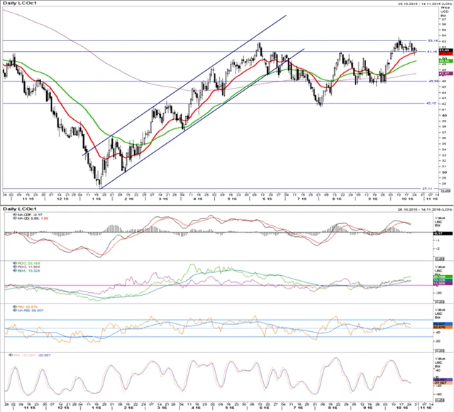 Ropa se obchodovala do strany bez výraznějšího trendu. Nejbližší podpora je na 51,2 a nejbližší rezistence je na 53,14. MACD prorazila signální linii shora a dále klesá. Rovněž RSI je blízko proražení 50bodové hranice. Hlavní protirůstový signál potvrdila MACD. Technické indikátory vykazují protirůstové tendence. Další pokles RSI pod 50 bodů by potvrdil proražení podpory.