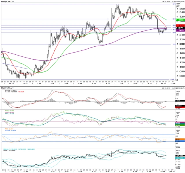 Cena zlata je na úrovni 200denního průměru, ale výrazně pod 50denním průměrem. Rezistence je na 1 272 a podpora na 1 250. MACD prorazila signální linii zespodu v negativním pásmu (býčí signál). Linie ROC20 prorazila ROC60 a stoupá. RSI míří k 50bodové hranici. Její proražení by potvrdilo prorůstové tendence. Technické indikátory značí proražení málo testované rezistence na 1 272.