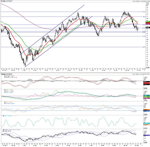 Cena ropy klesla pod klouzavé průměry. Došlo k proražení podpory na 45,44 USD, která se stala novou rezistencí, nejbližší podpora je na 43,3 USD. Pokles MACD se zastavil a její odstup od signální linie se zmenšuje. RSI zformoval dvojité dno a zespodu prorazil hranici přeprodanosti. ROC a SMI také naznačují růstové tendence. Rovněž došlo k odrazu ceny od spodní hranice Bollingerova pásma. Technické indikátory vysílají býčí signály, což potvrzují zejména RSI a ROC. Hrozí proražení málo testované rezistence na 45,44 USD. Překřížení signální linie zespodu MACD linií by jen potvrdilo vývoj ostatních indikátorů.