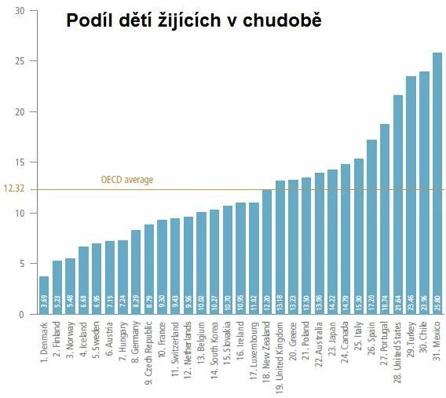 Skoro 46 milionů Američanů využívá potravinové lístky. Za poslední rok jich přibylo přes 8 %. Velká část z nich jsou děti. Americký sen je minulostí, podle údajů OECD jsou Spojené státy čtvrté nejhorší ze všech členských zemí právě v podílu dětí žijících v chudobě. Česká republika si "může pískat", je na devátém místě za Německem s necelými 9 % chudých dětí.