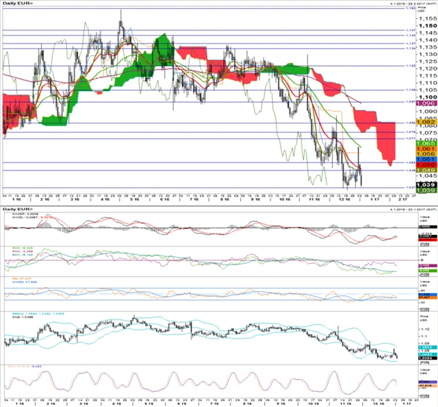 Měnový pár EUR/USD se opět propadl pod svůj 20denní průměr, což je silný medvědí signál. Nejbližší podpora je na úrovni 1,037. MACD se shora blíží ke své signální linii. RSI klesá k 30bodové hranici. SMI rovněž pokračuje v sestupu. Technické indikátory vysílají medvědí signály. Nedomníváme se ale, že by mělo dojít k proražení podpory na 1,037. Spíše očekáváme pohyb stranou v intervalu 1,037 až 1,054.