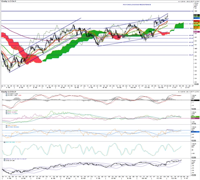 V očekávání začátku platnosti dohody OPEC se ropa dostala nad 55 dolarů za barel. Nejbližší podpora je právě na této úrovni. Nová psychologická rezistence je na 60 dolarech za barel. Od konce roku přešlapuje MACD na místě. Sice proťala zespodu svoji signální linii, býčí signál je ale poměrně slabší. Navíc se nachází poměrně daleko od nuly, což značí překoupený trh. Rovněž RSI se nachází v pásmu překoupenosti. Naopak SMI ukazuje, že je ještě prostor pro další růst. Cena se pohybuje podél horní hranice Bollingerova pásma. Technické indikátory ukazují na překoupenost. Dohoda OPEC ale podpořila apetit investorů, a cena ropy by tak mohla atakovat nová lokální maxima.