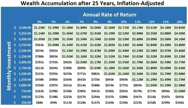 V levém sloupci jsou částky pravidelných měsíčních investic, horní řádek ukazuje očekávanou roční míru zhodnocení. Částky v tabulce jsou výsledné obnosy po 25 letech investování (spoření).
